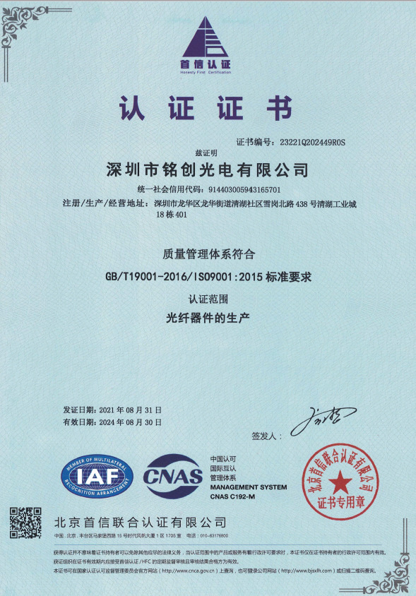 深圳市銘創(chuàng)光電有限公司于2012年成立,公司總部位于深圳市光明區(qū),是一家國家級高新技術(shù)企業(yè),通過了IS09001-2015質(zhì)量管理體系認(rèn)證和IS014001-2015環(huán)境管理體系認(rèn)證;經(jīng)過多年的持續(xù)研發(fā)投入和專注發(fā)展,銘創(chuàng)光電已逐漸成為光纖激光器、光纖傳感、激光雷達(dá)和激光通信等領(lǐng)域的綜合性產(chǎn)品服務(wù)商。 公司目前設(shè)立有光無源器件研發(fā)生產(chǎn)中心和激光研發(fā)生產(chǎn)中心。無源器件研發(fā)生產(chǎn)中心設(shè)有有高標(biāo)準(zhǔn)的無塵車間,可提供各種波長的無源光纖器件、高功率光纖器件、保偏光纖產(chǎn)品、超小型光纖器件。激光研發(fā)中心建立在安徽合肥市,研發(fā)生產(chǎn)特殊波長的激光光源、光纖激光器、光纖放大器以及新產(chǎn)品的技術(shù)研究儲備。研發(fā)生產(chǎn)中心與多地科研單位合作,能夠迅捷高效的為客戶提供相